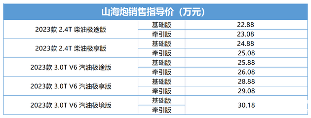 在上午的广州车展上,长城全新大型高性能豪华SUV—— 山海炮正式上市了,新车提供2.4T柴油和3.0T V6汽油两种动力版本,其中2.4T柴油版包含2款配置车型,售价区间为22.88-24.88万元,3.0T V6汽油版包含3款配置车型,售价25.88-30.18万元,另据官网显示,每个车型都提供基础版和牵引版可选(除极境版外,极途版和极享版在配置上并无明显差异,区别就是可否选装智能安全包),牵引版的价格比基础版要高2000元,极境版二者的价格相同。那么对于消费者来说,不同车型之间的配置有哪些差异,哪个版本更值得买呢?下面我们就来详细分析一下。