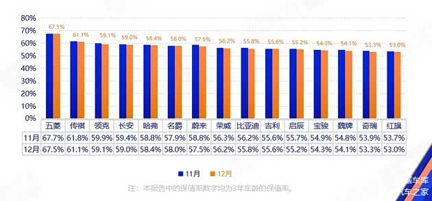 五菱以67.5%的保值率继续稳居第一,但环比上月下降了0.2个百分点。排在第二的是传祺,最新保值率是61.1%,环比上月下降0.7个百分点。第三名的领克也环比下降0.8个百分点,12月保值率为59.1%。