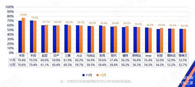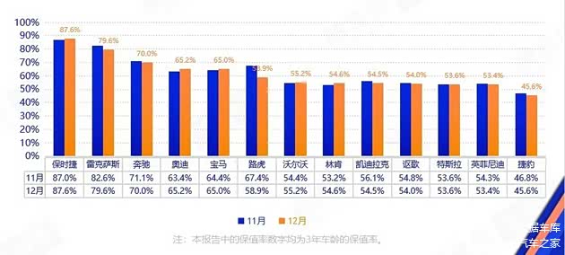 涨幅最大的是保值率大多数时间在BBA中垫底的奥迪,从11月的63.4%升至65.2%,上涨了1.8个百分点。宝马虽然也上涨了0.6个百分点,但保值率却以0.2%的劣势屈居奥迪之后,奥迪也由此将“BBA”排序改写为“BAB”。涨幅排名第二的是林肯,最新保值率是54.6%,相比上月上涨1.4个百分点。保时捷、沃尔沃的保值率也有微弱上涨。
