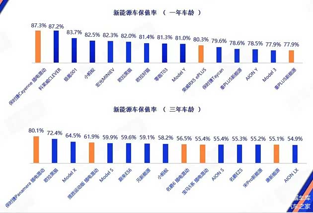 三年车龄保值率最高的前四款新能源车型依旧分别为保时捷Panamera插电混动、欧拉黑猫、Model X、揽胜运动版 插电混动,第5名则由蔚来ES6变为Model S,也就是说,前五车型中特斯拉占了两席。