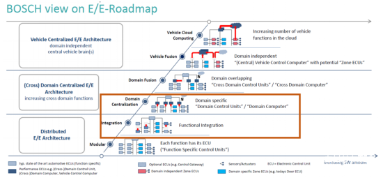 上图为Bosch规划的汽车E/E架构发展路径,当前主流架构处于控制器整合或域集中式阶段,通过将控制器整合降低购车成本,也通过将一大类功能整合到域控制器中,降低开发的复杂性,让工程师有更多精力优化现有功能和为客户开发新功能。
