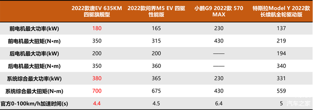 对于热爱驾驶的用户,纯电车型大扭矩瞬间释放的技术特性能让他们可以随时享受肾上腺素飙升的酣畅加速体感。四款车型中,性能实力2022款唐EV一骑绝尘,零百加速仅需4.4s。而问界M5 EV和小鹏G9分别为4.5s、5s,表现可圈可点,小鹏G9则受制于价格,两驱版性能自然要弱上许多。