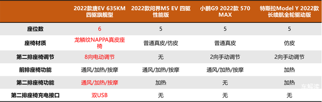 从内部舒适配置上来进行对比,2022款唐EV、问界M5 EV、小鹏G9均展现出了中国品牌的高配置流优势,前排多向电动调节、座椅通风、加热、按摩一应俱全,同时在全车座椅皮质的运用、海绵的软硬铺设上也相当到位,Model Y在这一方面就显得有些掉队了。更进一步来看,2022款唐EV在二排也加上了通风、加热功能,并且前中排均提供5种按摩模式+3档按摩强度的10点式按摩,再加上四款车型中面积最大且是唯一可开启的电动防夹超视觉星空全景天窗,乘坐舒适性更高。