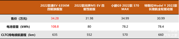 由于车型售价跨度区间较大,我们划定35万元及以下选取各款车型的最高配置版本。分别是售价34.28万元的2022款唐EV 635KM四驱旗舰型、售价31.98万元的问界M5 EV四驱性能版、售价34.99万元的小鹏G9 570 Max、售价30.99万元的Model Y长续航全驱版。