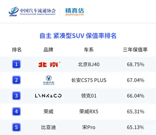 2、2022年最保值的五款国产紧凑型SUV分别为:北京BJ40、长安CS75 PLUS、领克01、荣威RX5和比亚迪宋Pro,它们的保值率也都超过了65%。令人比较意外的是,北京BJ40夺得了头名,它并不是主流车型,但凭借出色的“越野”特性,也收获了不少粉丝。长安CS75 PLUS获得亚军,还是比较令人认可的,毕竟它是国产SUV销量季军。领克01排名第三位,保值率达到了66.04%,荣威RX5和比亚迪宋Pro入榜前五,也是比较不错的。