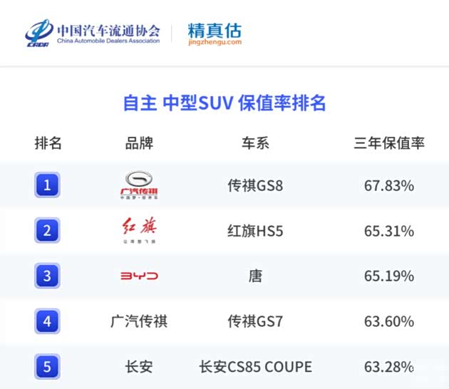 3、2022年最保值的五款国产中型SUV分别为:传祺GS8、红旗HS5、比亚迪唐、传祺GS7以及长安CS85 COUPE,传祺GS8夺得头名还是挺令人意外的,它的市场表现不如奇瑞瑞虎8,品质表现不如红旗HS5。而月销过万的豪华国产中型SUV红旗HS5获得亚军,比亚迪唐排名第三,保值率也超过了65%。传祺GS7和长安CS85 COUPE分列四五位,它们都不是主流车型,但品质表现确实不错。