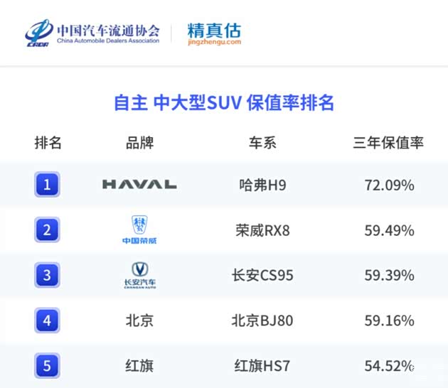 4、2022年最保值的五款国产中大型SUV分别为:哈弗H9、荣威RX8、长安CS95、北京BJ80和红旗HS7,它们的差距还是比较大的,哈弗H9夺得头名,保值率也超过了70%,所以哈弗H9也成为了最保值的国产SUV。而令人比较意外的是,长安CS95、北京BJ80和红旗HS7都是高品质国产SUV,其保值率反而不足60%。