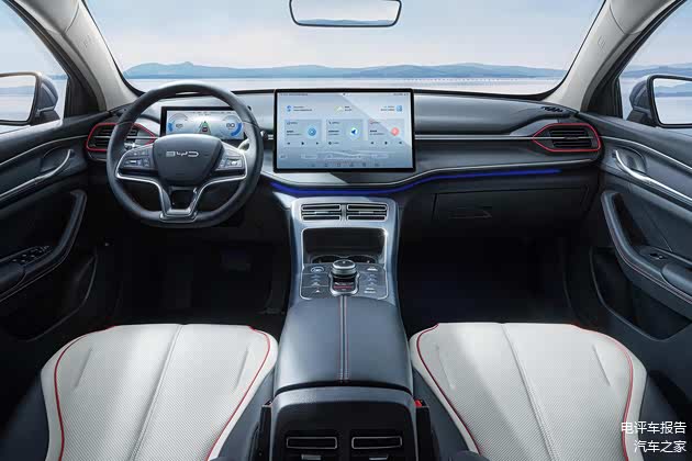 内饰方面,驱逐舰05的内饰很明显是比亚迪的家族风格,整体看起来非常简洁干练,用料和做工都相当出色。此外,新车最引人注目的一定是这两块大尺寸悬浮大屏,无论是整体显示精度、流畅度还是信息丰富度都值得称赞,能够旋转的中控屏会是比亚迪车型非常独特的存在。