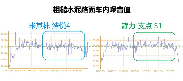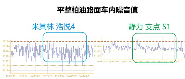 路噪较明显的平整柏油路面,两款胎都很安静,浩悦4将噪音值在54-58db区间,静力支点S1噪音值在56-58db区间,浩悦4更安静一点。主观感觉在安静柏油路,浩悦4几乎听不到胎噪,静力支点S1很安静,但仍能听到底噪存在。