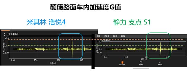 换胎后开了两天,静力支点S1明显优于 浩悦4的,是减震缓冲,同样速度跑颠簸路面,震动G值明显更低。浩悦4支撑较“硬”,减震能力不突出,一些明显的路面落差,颠簸传递到车内比较明显,相比之下会觉得静力支点S1有明显的缓冲感,更舒适。
