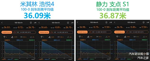 两款胎刹车距离都很出色,百公里刹车距离都少于37米,米其林浩悦4比支点静力S1刹车距离更短0.87米。
