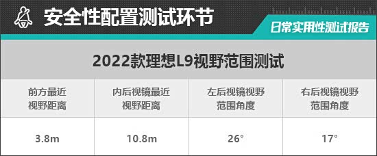 理想L9左右外后视镜均未采用双曲率镜片,但实测结果后,左右外后视镜视野范围较为可观,分别为26°和17°,加之理想L9配备并线辅助、车道偏离预警系统等功能,日常驾驶并线基本无压力。