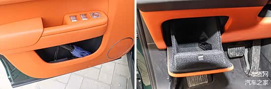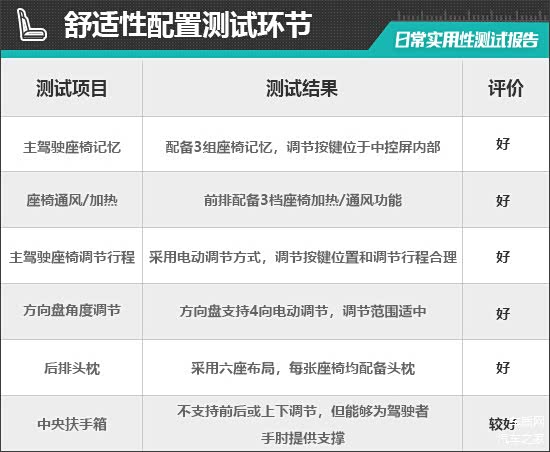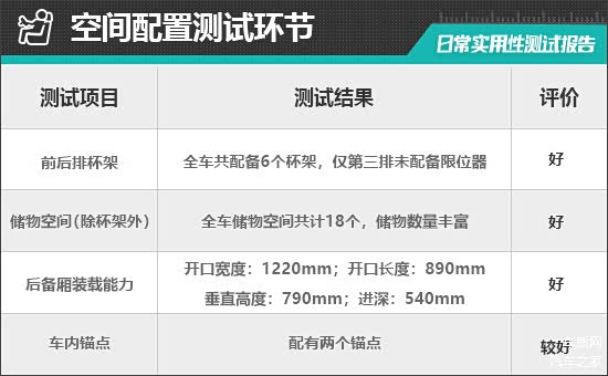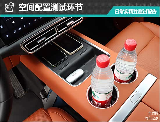 对于车内使用空间的测试,只针对前排触手可及的空间,不包括手套箱、中央扶手箱等需开启的空间。测试方法是将以下固定物品全部放置在前排的各个储物空间内,通过固定物品的放置情况来判断车辆储物空间的表现。测试选定的固定物品为:2瓶常规大小的矿泉水、1部大屏手机、1支口红、1个挎包、1副墨镜、1把折叠雨伞以及1包常规尺寸的抽纸。