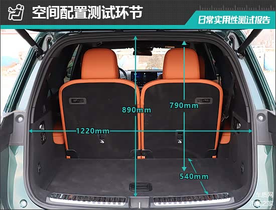 对于理想L9后备厢的基础数值,我们也进行了实测,开口长度为890mm;开口宽度为1220mm;后备厢进深为540mm;后备厢地台与内部车顶的垂直高度为890mm。