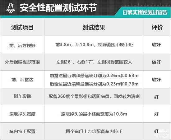 在车辆前、后方视野测试中,车内所有座椅均已调整至最低状态,所测出的数据与驾驶者正常使用时均有一些偏差,仅供参考。