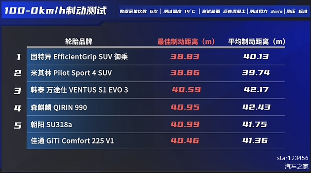 而另外场景环境中单独测试的六款轮胎中,原厂佳通十次均值41.36米,最好的米其林39.74米。