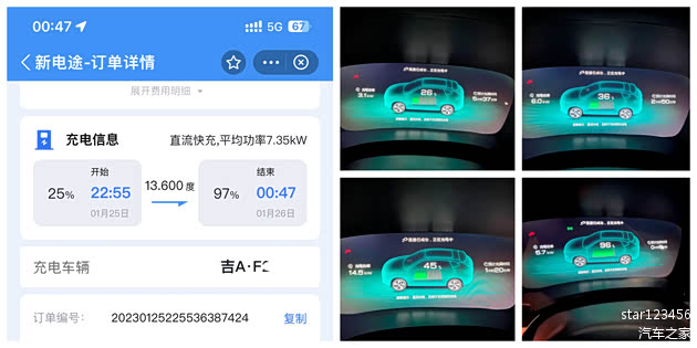 第二次是在午夜时分,仪表显示室外温度零下18℃,这时候电费是0.74元/度,从亏电初始值25%开始充,开始也是3kw左右,20多分钟后,达到6kw,35分钟后达到最高值14.5kw,此时电量充到45%,这也基本是全程最高功率,再之后的充电功率大都维持在6-10kw之间,截止跳枪,耗时112分钟,充电13.6度,APP显示SOC充至97%,车内显示100%
