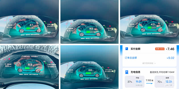 第一次是中午室外温度零下7℃左右,这时候充电也是比较便宜,1.05元/度,插枪充电一直在3kw左右,与在家使用交流便携差不多,20分钟后,提高到4.3kw,30分钟左右5kw,50分钟左右9kw,充到1小时,最高9.3kw的充电功率,60分钟一共充了7.1度电。