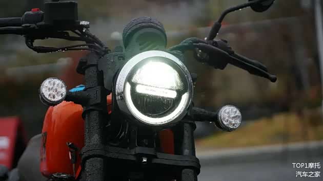 车灯部分,延续了闪150的设计,圆形单头灯搭配LED日行灯带,以发光的QJMOTOR标志,分割远/近光灯的功能区域,精致感营造的很到位。融入复古风格和现代科技的梅花状LED日行灯也是一大亮点,后尾灯和刹车灯集成到后转向灯当中,让尾部区域更加简洁美观。