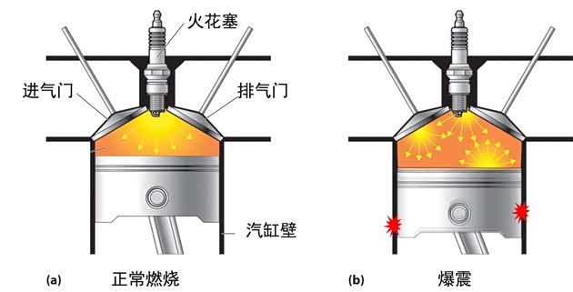 但是提前点火也有风险,那就是爆震。什么是爆震呢?简单来说就是混合气燃烧太猛烈,不受控制了,像爆炸一样。因为正常情况下火花塞点火后混合气只有一小部分被引燃,这部分火焰向外传播,继续引燃其他混合气,这样气缸内压力上升很平稳。而爆震指的是火花塞点火后所有混合气瞬间同时剧烈燃烧,这种燃烧就像爆炸一样,此时活塞正在向上压缩,剧烈的冲击力会阻碍活塞运动,甚至会损坏发动机,这就叫做爆震。爆震不仅仅会增加油耗降低动力,还可能损坏发动机。