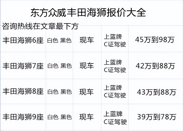 目前东方众威丰田海狮13座版售价38万元,9座版售价48万元,7座版售价52万元。丰田海狮七座九座比奔驰V级还奢华,海狮是丰田品牌旗下的一款经典MPV产品,他的空间更大,真实定位水平并不输于丰田埃尔法。全新的丰田海狮为了突出车辆的空间不仅采用了高车顶设计,而且还采用了长车头设计,进一步提升了车辆的空间利用率,而且整车的安全性也有了一定的保证。
