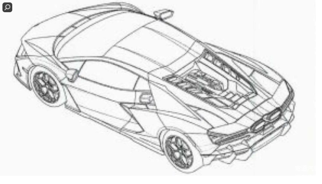 专利图片更清晰地展示了新款兰博基尼的外观。更具侵略性的 LED 行车灯排列在前端,两个棱角分明的折痕突出了引擎盖线条。尾部有等角度的尾灯,两个巨大的中央排气从保险杠中突出。