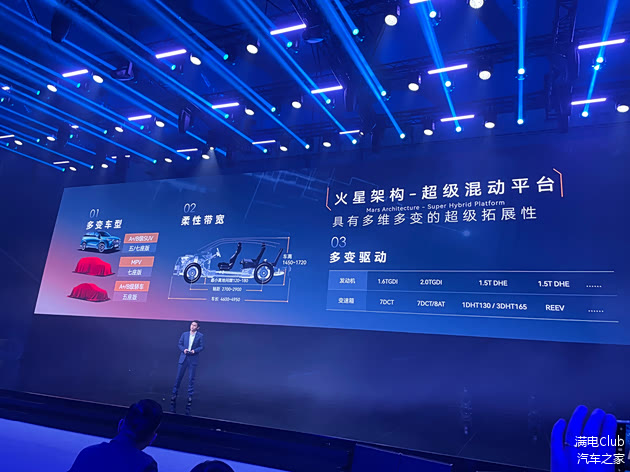 火星架构超级混动平台灵活拓展性高,体现在三个方面:第一,多变的车型,不仅可开发A+到B级SUV车型,还能支撑A+到B级轿车、MPV等车型的开发;第二,柔性带宽,如:轴距带宽从2700到2900,车高带宽1450到1720之间自由组合变化;第三,多变的驱动形式,涵盖了发动机排量1.5T到2.0T的ICE、PHEV、REEV等动力组合。
