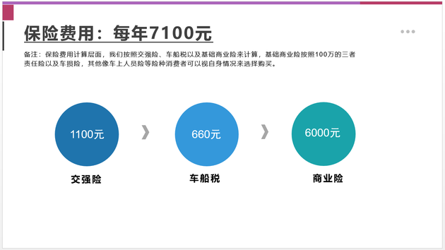 保险费用计算层面,我们按照交强险、车船税以及基础商业险来计算,基础商业险按照100万的三者责任险以及车损险,其他像车上人员险等险种消费者可以视自身情况来选择购买。我们的价格不考虑多年不出险的市场折扣价。