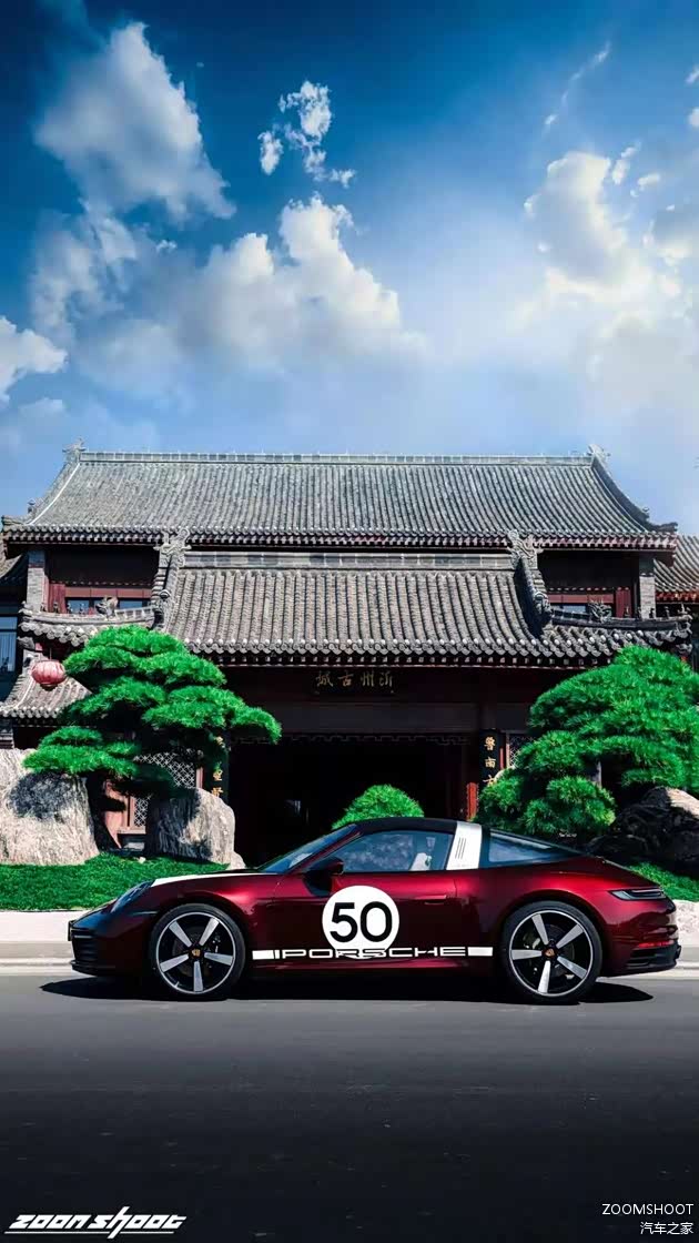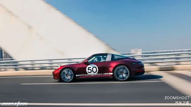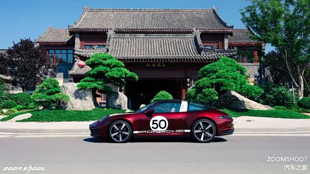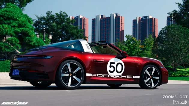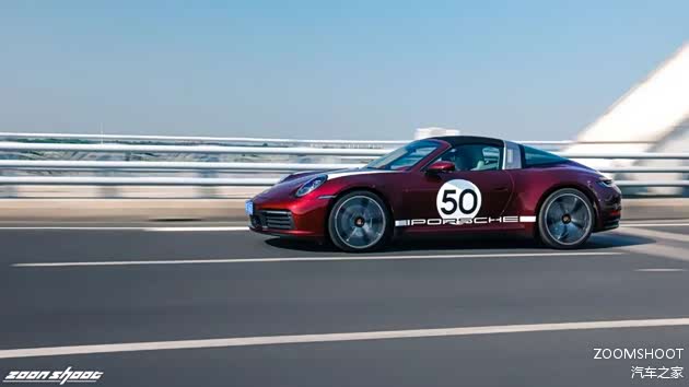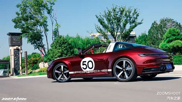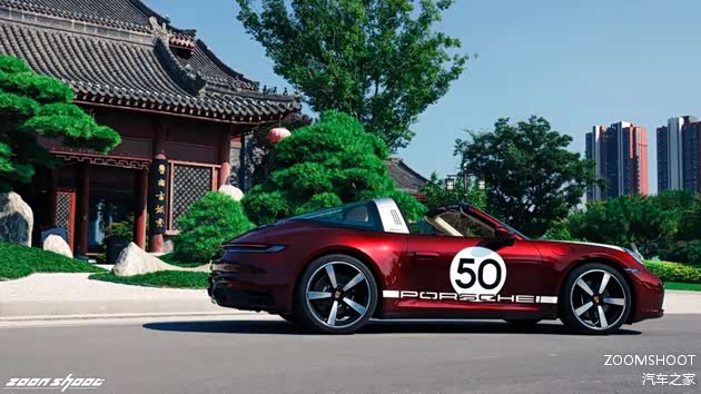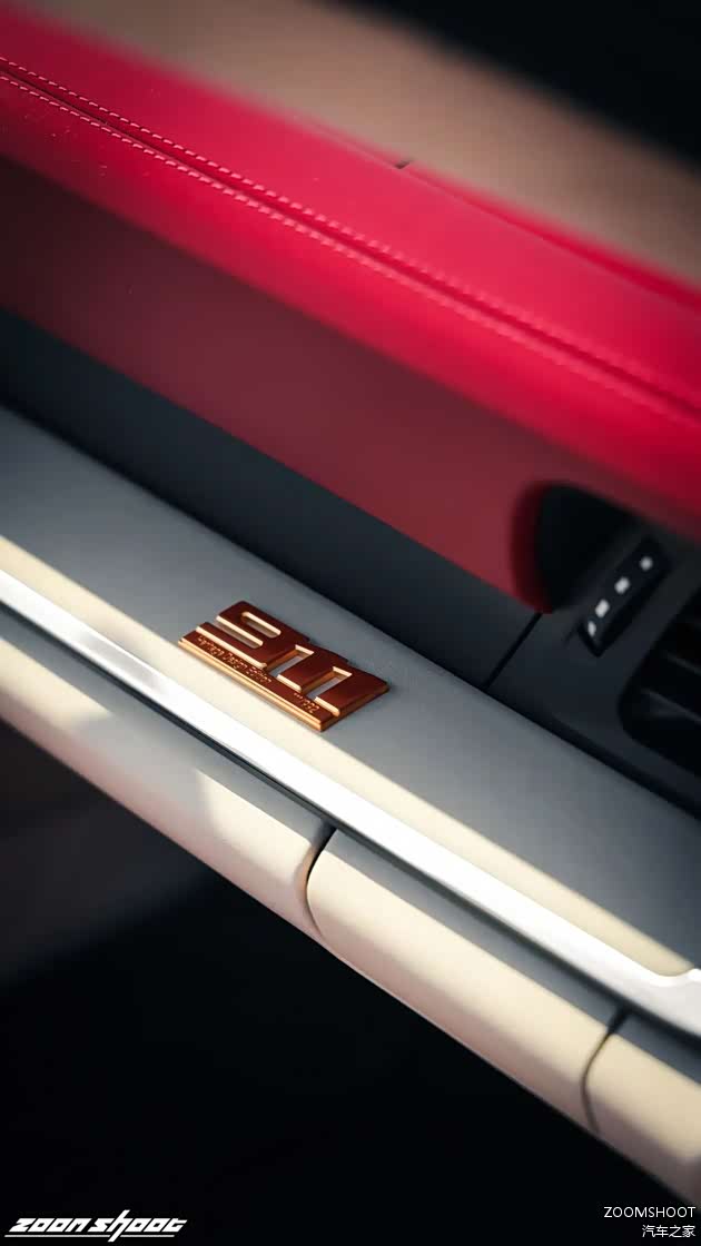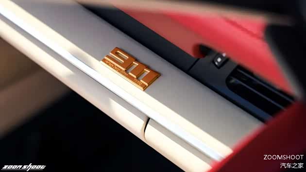 在上完历史课与工程学课程后,让我们稍作休息,聊聊这台Heritage Design的重头戏——复古设计。这台911在设计上把复古与现代的界限把握得相当出色,既不会过于矫揉造作,也不会泯然众人。车头的白色战纹来自真正的保时捷赛车,而车侧的“50”也是来自真正的保时捷赛车编号,独特的车厘子红色金属漆是为复古的韵味又增添了一丝神秘与魅惑,值得一提的是,全车的保时捷徽标都用上了1963款的logo,也许这一点只有保时捷的老车主才能感受得到吧。