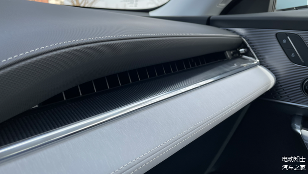 即便是门板,Electra E5对“设计”和“精致”的追求也体现得淋漓尽致。像纤细的内嵌式氛围灯、多种纹路的金属饰板和软性材质的交叉拼接等等,给人的触感和观感都十分细腻。