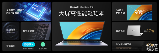 华为MateBook D 16新品最高搭载13代英特尔®酷睿™ i9处理器,突破轻薄本性能瓶颈;在屏幕方面同样出色,采用16英寸全高清 IPS防眩光屏,并且获得德国莱茵硬件低蓝光认证[1],带来舒适、酣畅的视觉体验;搭载华为超材料天线技术,网络连接能力显著增强,网速更快信号更稳定;超级终端打破多设备间协同壁垒,带来更简单的设备连接方式。华为MateBook D 16新品将美学设计、创新科技以及智慧体验引入年轻消费群体,大屏幕强性能,助力高效办公的同时提高工作舒适性。