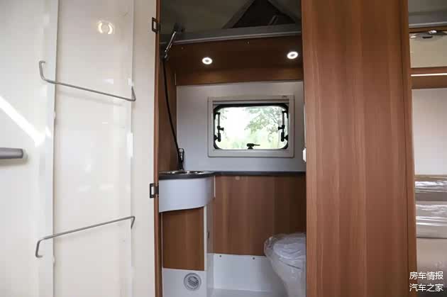 卫生间区域用的是赛特福德一体成型时的马桶,侧面是一个水池,和洗漱镜,上边有一个可以拉上来当花洒的挂架,升顶后上面也是可以通风的,整个空间还是不错的,马桶前面这个区域正常的坐下是比较宽松的,在卫生间的门上原厂还给了两个可以晾衣服的挂架,这还是蛮实用的。