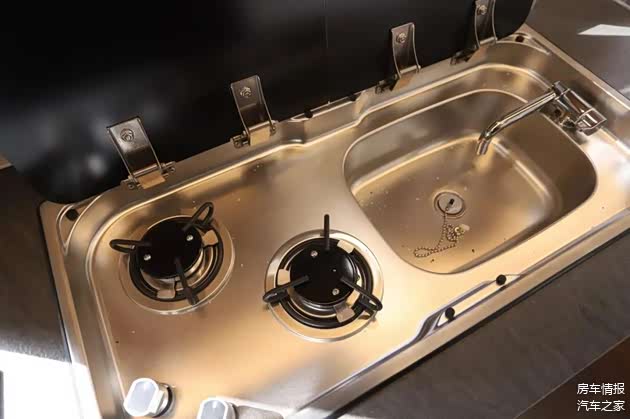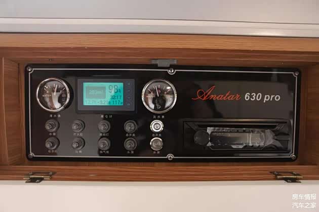 厨房区域配有车内一体式灶台、洗手盆,不锈钢的设计显得更整洁美观,可折叠式水龙头,洗菜池下方抽拉式橱柜方便了日常储物需求,房车专用底置空调,烟雾报警器,五孔插座等等满足了旅途做饭的需求。这款车使用的是弗罗斯特118升冰箱,入户门上方整车控制面板,大量的机械按键,简单明了,对于老年人也极其友好,这里可以看到包括水箱水位显示,电量表,以及各区域灯光开关等。