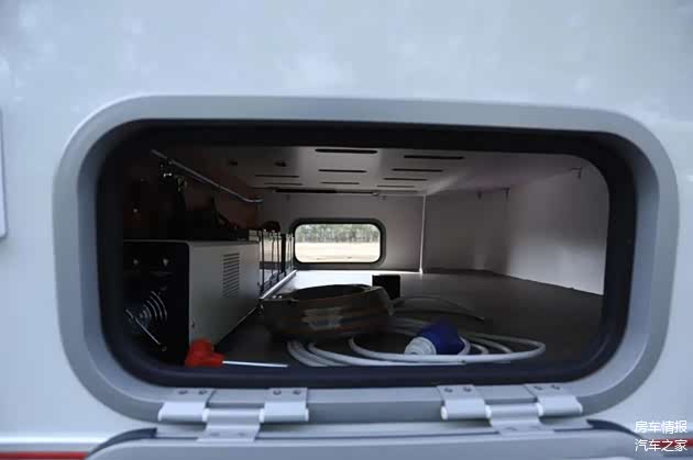 绕车一周我们看一下,在车量后方有一个超大的储物箱,车身外部12V/220V取电口,,户外照明灯,外接电源,水箱加水口等等设备一应俱全,同时车顶部是可以升高的,升顶高1.98米,唯一要说的一点是外置才柴油炉灶,遮阳棚,自行车架等设备是需要选装的。