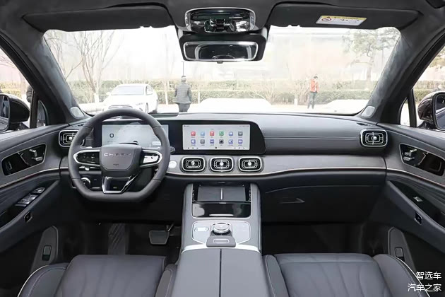 瑞虎9的内饰采用了全新的设计布局,比较醒目的便是双12.3英寸一体式联屏,同样的设计在瑞虎8 PRO、艾瑞泽8上我们已经有所见过。空调出风口采用的是方形,内部形成回字形结构,看起来颇为别具一格,整个中控台并没有设置实体按键,显得比较简洁。