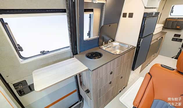 会客区对面是厨房区域,厨房区域配备800W的电磁炉带盖板洗菜池,厨房上部是超大的储物空间,能放置各类厨具物品。厨房吧台一侧还设计了翻折板,很好的拓展了厨房操作台的面积。瑞弗启界R800还配备了微波炉和房车专用118L双开门冰箱。