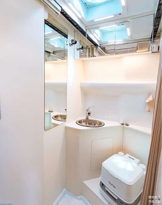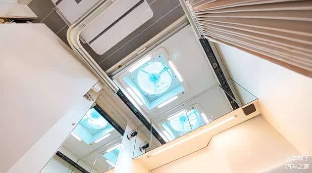 厨房下方有暖风出风口,保证你冬天的温暖,头顶是特莱尔的房车专用空调,前后两个出风口快速制冷,保证夏天车内制冷效果。