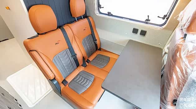 会客区双人座椅的设计,整车核载4人,座椅采用M1乘用车级别,座椅可前后仰辅的独立调节,不仅乘坐舒适性好,腿部空间也十分大。前方是一张矩形餐桌,无论办公还是就餐都十分方便。餐桌旁边还贴心设计了两个充电插口,可以满足你的各种需求。头顶上方配备2个储物柜,能放置旅行中的物品。
