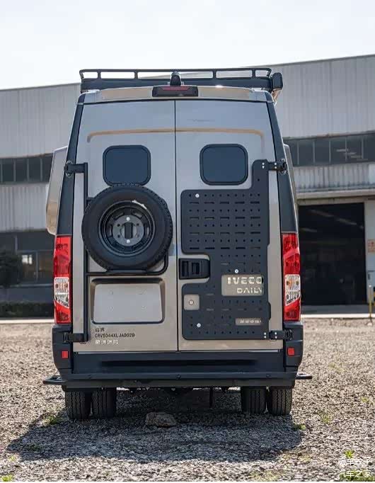 车身左侧尾部是瑞弗独有的家族化盲窗设计,能很好的增加车内床铺的长度,车身尾部还贴心的设计了一个备用轮胎,并且旁边配置的是一个超大的洞洞置物板。