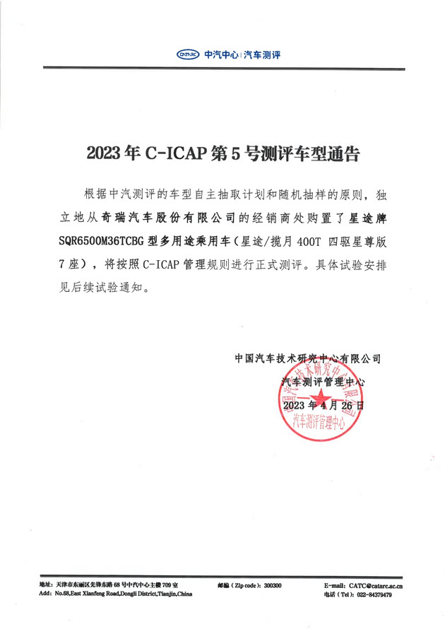 根据中汽测评的车型自主抽取计划和随机抽样的原则,独立地从奇瑞汽车股份有限公司的经销商处购置了星途牌SQR6500M36TCBG型多用途乘用车(星途/揽月400T 四驱星尊版 7座),将按照C-ICAP管理规则进行正式测评。具体试验安排见后续试验通知。