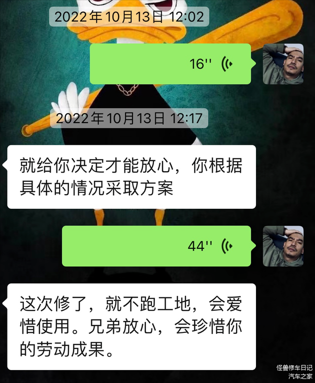 既然大哥要喷漆,咱们也得说好,做好漆回去,如果还是要跑工地的话,咱就没必要喷了,因为那就是完全浪费钱,大哥也表态了:不跑工地了,会爱惜使用。