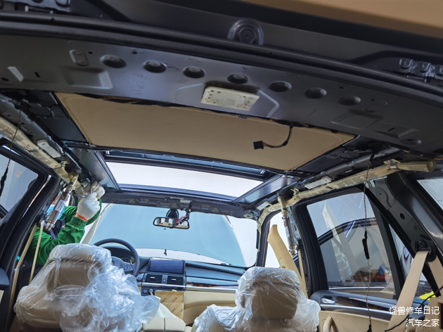 天窗问题咱们算是尽力处理了,至少不会漏水了,老车嘛,有点美中不足也是正常的,达到十全十美是很难做到的。继续回装内饰了,咱们师傅还是比较细心的,带了个全新白手套进行施工,就怕把内饰给弄脏了。