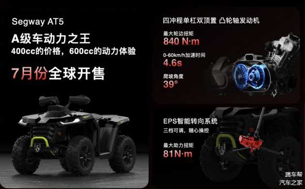 新车搭载四冲程单缸双顶置凸轮轴发动机,最大轮边扭矩840N·m,仅需4.6秒即可完成0-60公里/小时的加速,。从资料图来看它用的是中置布局,还有四驱系统,官方表示还会配备前后桥差速锁……所以它应该会有一个不错的越野能力以及拖拽能力,是户外出行、沙滩游玩的好玩具。