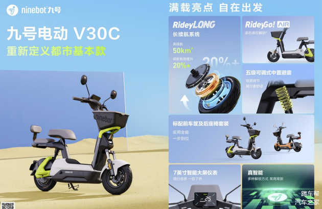 此外,V系列还搭载了全新的RideyGo!AIR姿态感应解锁功能,可扶正自动解锁并启动,这算是相当方便且前卫的一个功能。另外小V还有五级可调式中置减震、7英寸智能大屏仪表盘和智能大灯,标配前车筐及后座椅套装。