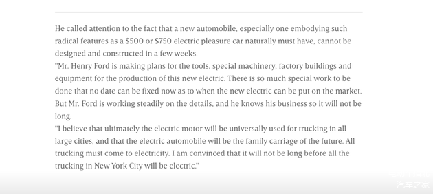 1914 年 5 月,爱迪生在接受《Automobile Topics》发表了非常重要的演讲《就要来了,耐心等待就好》,大概的意思是新的廉价电动汽车(500 美元或 750 美元)的机械、工厂等方面由福特完成,请大家相信福特先生的能力不会让大家等太久。并且未来电动机将统治大城市的货运市场并走进千家万户。