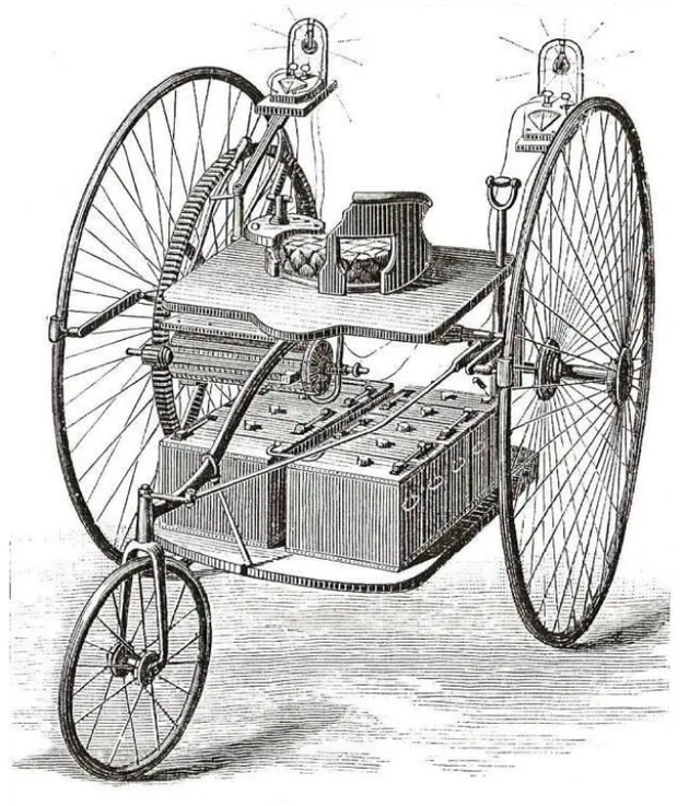 有些观点认为第一台汽车是1881年法国人古斯塔夫·特鲁夫发明,这也是一台电动汽车,使用的是可以充放电的铅酸电瓶,配合的也是直流电机;这个观点是不对的,动力电池能否充电不影响这种载具是不是汽车的定义,影响的只有使用成本和便利性。但是这台车确实更有现代汽车的雏形,而且依旧比卡尔·本茨更早,其三轮汽车是1886年发明的,晚了五年哦。