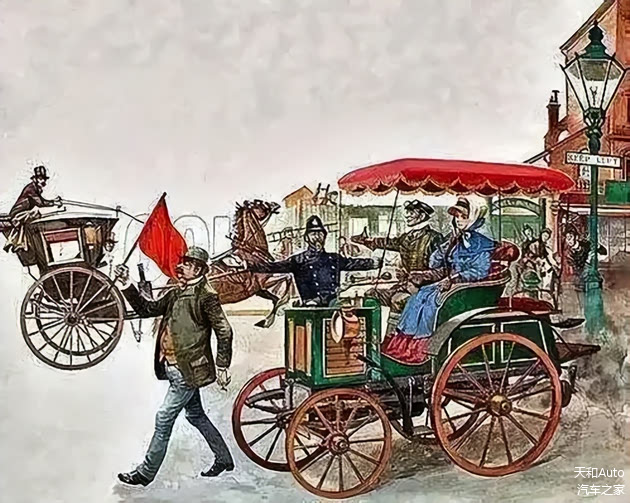 可能大多数汽车爱好者都没有听过红旗法案,毕竟年代太久远,红旗法案发布于1865年的英国;其要求是汽车行驶的时候必须一个人手持红色旗帜或者煤油灯徒步走在车辆的前方,作用是用于警示行人和旁观者。铁路机车需要三名工作人员引导或驾驶。在车辆前方的人要与汽车间隔六十码的距离徒步进行引导,而车辆的车速也只能与行走的速度相当,这就是红旗法案对汽车的要求。