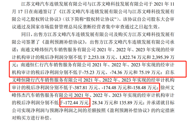 当时,文峰股份子公司文峰汽车本拟斥资5.38亿元收购四家标的公司。不过蹊跷的是,四家公司只有一家净利润为正,且在双方签署的《补偿协议》中,出售方承诺的业绩还出现了负数。同时,标的公司还存在被文峰集团占用资金的情况,文峰股份若想买下标的,还需先替文峰集团还债。