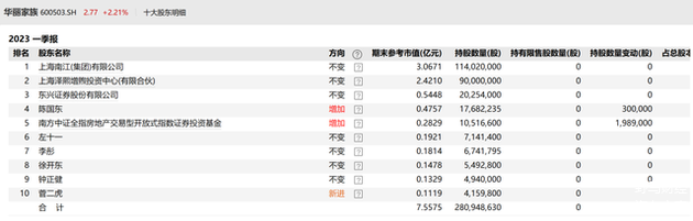 截至今年一季度,华丽家族的前十大股东中有三家机构,除泽熙增煦外还有大股东南江集团和三股东东兴证券,分别持股7.12%和1.26%,另有包括知名牛散徐开东在内的6名自然人和一家基金。董监高中除财务总监王坚忠外无人持股。