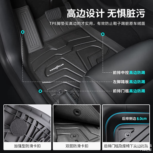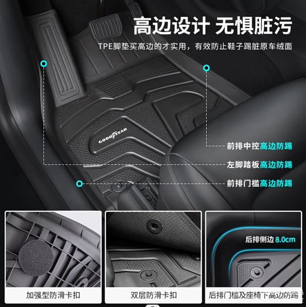 独特贴心的高边设计,除了可以牢固可靠的防止脏污渗入原车底部绒面,还能有效避免裸露的侧壁绒面被踢到而留下印记,可谓是细节与质感齐肩并驱。